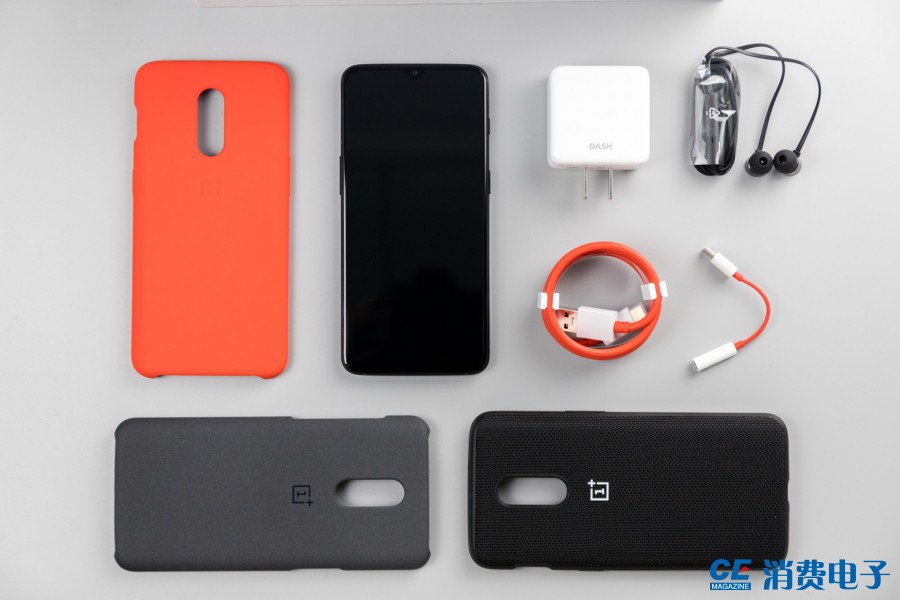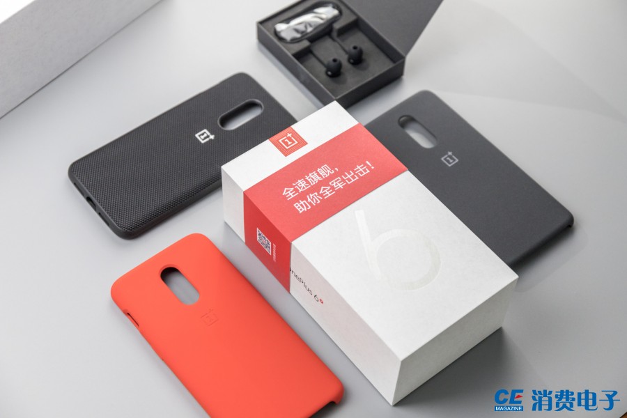 The main products in the packing box are 3 protective shells (red silicone, sandstone black, nylon), a white fungus 2T earphone and a main body box of OnePlus 6T.