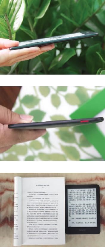 Like a 6-inches conventional screen of phone size, iReader Light seems light and unique, and then with curved back shell and round corner, very beautiful and very artistic. The 8mm thickness and the weight of 142g show its popularity. The design of border-narrowing micro-process abandons the framework, shaping the “thin and thin feathers” image. Its topped with red switch button , fashion-sense revealing。Screen surface ,with anti glare film material, delicate and excellent texture, and then with a higher contrast of the Carta screen。Black and white design actually enhances the reading texture。